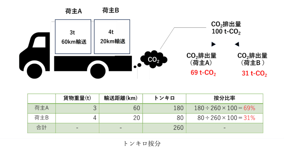 この場合、それぞれの荷主が実際に使用した燃料消費量や燃費を正確に把握できないため、燃料法・燃費法では、燃料消費量や燃費を、基準に基づいて荷主ごとに按分する必要があります。輸送区間ごとの貨物重量に基づいてCO2排出量を按分するのが望ましいですが、実際にはそのような詳細なデータの把握が難しいため、実務上では燃料法・燃費法ともに貨物の重量(t)と輸送距離(km)を掛け合わせたトンキロによる按分が用いられています。