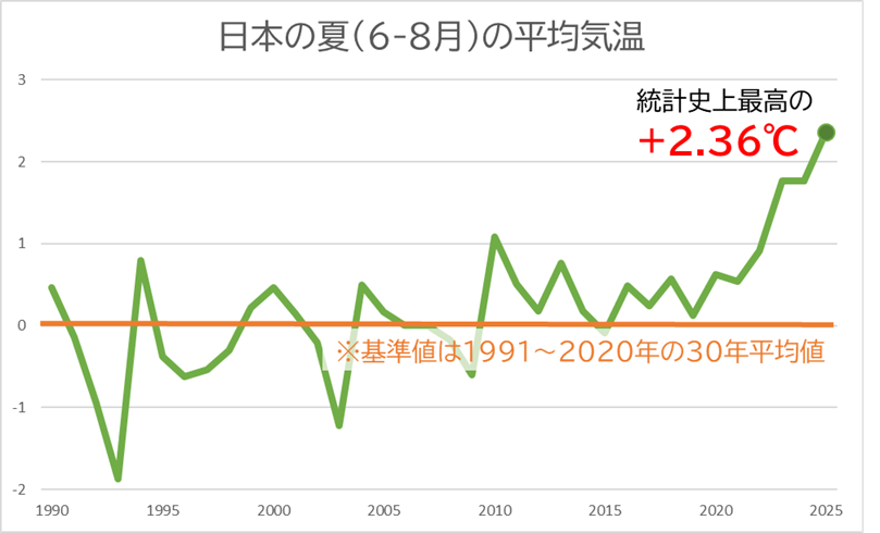 気象庁は、2025年の夏(6~8月)の平均気温が統計開始以来127年間で最も高かったと発表しました。平年との差は+2.36℃となり、これまでの記録だった2024年と2023年の+1.76℃を大幅に上回っています。日本各地で猛暑日が続き、電力需要の増加や農作物への影響、熱中症による救急搬送の増加など、私たちの生活や経済活動に直接的な影響を与えました。