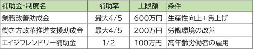 さらに、近年の猛暑を受け、熱中症対策も重要課題です。2025年6月施行の改正労働安全衛生法では、事業者に対し作業環境の暑さ指数(WBGT値)の把握や、作業計画・緊急対応手順の整備が義務付けられました。特に製造業や建設業など屋内外での作業が多い業種では、温度管理や休憩時間の確保、空調服の導入など、従業員の健康を守る環境整備が必要です。こうした対策にも補助金制度を活用できる場合があります。2025年10月時点での中小企業が利用可能な補助金制度は以下のとおりです。